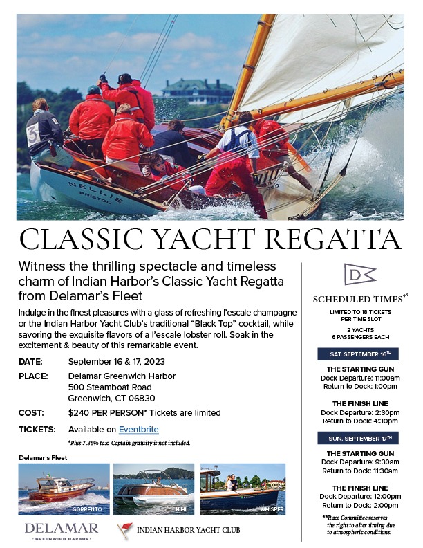 Delamar Greenwich Harbor will have an exclusive partnership with Indian Harbor Yacht Club this year for their Classic Yacht Regatta on September 16th and 17th.