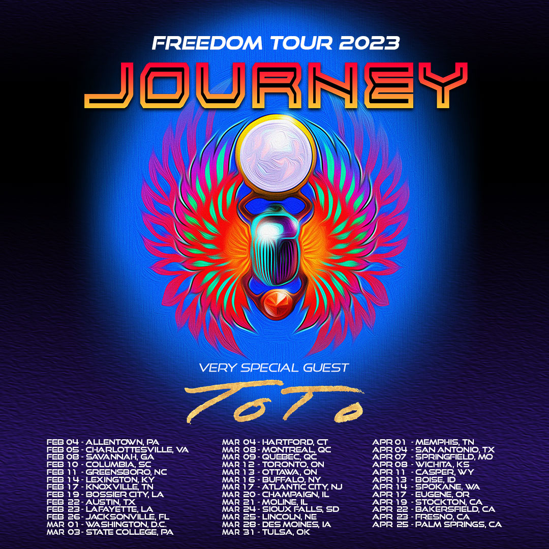 October 19, 2022 – One of the most legendary rock bands of all time, JOURNEY, announces the continuation of their highly successful tour with the 50th Anniversary Celebration Freedom Tour 2023 featuring, very special guest TOTO.  JOURNEY, Diamond-selling Rock & Roll Hall of Famers will take the stage in 38 cities across North America with their catalog of global chart-topping hits, including “Don’t Stop Believin”, “Any Way You Want It”, “Faithfully”, “Lights” and more.