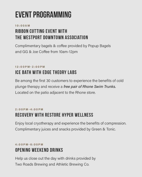 “We are thrilled to open a flagship store in our home state of Connecticut where we created the Rhone brand nearly 10 years ago” said Nate Checketts, Co-Founder & Ceo. “We have a lot of local pride and believe this is not only a great area to build a business and brand, but to also build community. Westport has already been incredibly welcoming and our team is looking forward to serving our customers here.”
